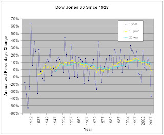 Today's post, though, is really about the graph above, showing 1 ,10, and 20 year returns on the Dow since 1928 (from December to December). From December 3, 2007 through December 1, 2008, the Dow lost 37% of its value. This horrible run is beaten only once, from December 1930 to December 1931, when the Dow lost 53%. The years 1930, 1937, and 1974 (again, December to December) were the only other years where the 12 month loss was more than 20%.